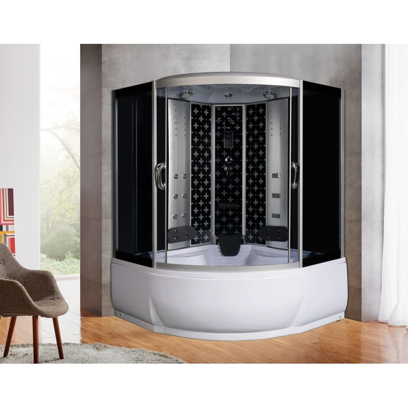 Закрытая герметичная конструкция предназначена для угловой установки в больших ванных комнатах. Устойчивость широкого акрилового поддона с антискользящим покрытием обеспечивают регулируемые опорные ножки. Гибкая подводка и слив-перелив с гидрозатвором скрыты за металлическим экраном. Двухместная душевая кабина выполнена из закаленного стекла толщиной 5 мм. Двойные металлические ролики на профиле аккуратно и бесшумно перемещают раздвижные двери. Душевую систему образуют верхний тропический душ, ручная лейка на регулируемой штанге и фиксированный излив, заполняющий ванну водопадным потоком. Вертикальный гидромассаж работает от 17 форсунок на центральной и двух боковых стойках. Он расслабляет, успокаивает, оказывает мягкий лечебный эффект. Управление режимами работы форсунок, радио и громкой связью – сенсорное, от LCD-дисплея. В комплектацию также входят зеркало, двухъярусная полка, встроенное сиденье и подголовники.