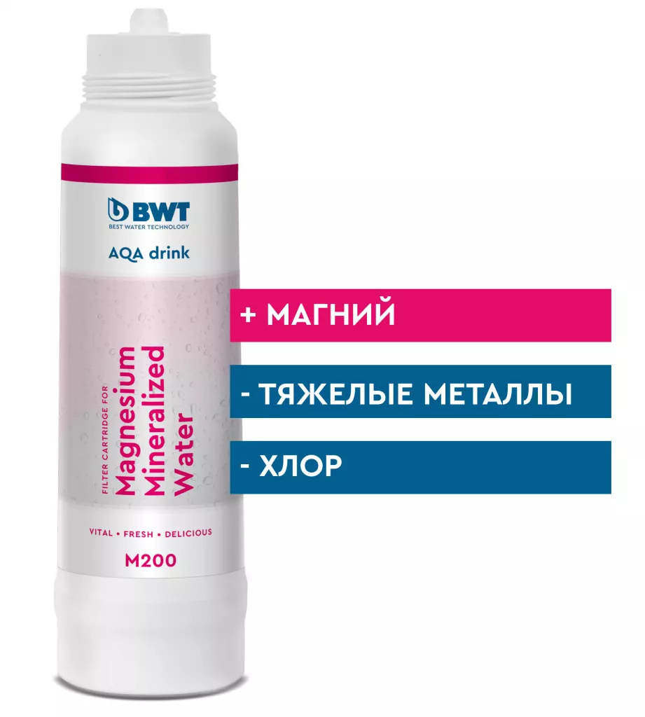 - Обогащение воды магнием с помощью запатентованной технологии BWT Magnesium Technology, которая помогает нормализовать минеральный баланс в воде. Магний отвечает за формирование вкусовых характеристик воды и способствует оптимальному раскрытию её вкусовых качеств. Кроме того, магний играет важную роль в организме человека, помогая снизить утомляемость и бороться со стрессом. Он также поддерживает работу мышечной и нервной системы.