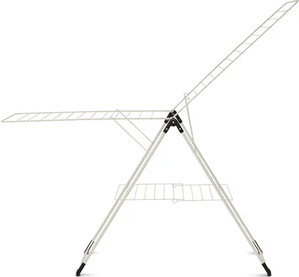 Напольная компактная сушилка Brabantia для белья произведена из нержавеющей стали, что объясняет ее долговечность. Матовое покрытие в оттенке «слоновая кость» защищает изделие коррозии и окисления, оно не трескается и не шелушиться. Конструкция с регулируемыми «крыльями» удобна для размещения как мелких, так и объемных вещей. Одежду из деликатных тканей можно сушить в расправленном виде – для этого предусмотрена отдельная полочка. Специальный механизм надежно фиксирует сушилку в разложенном виде. Прочные защитные колпачки на ножках предотвращают повреждение пола.